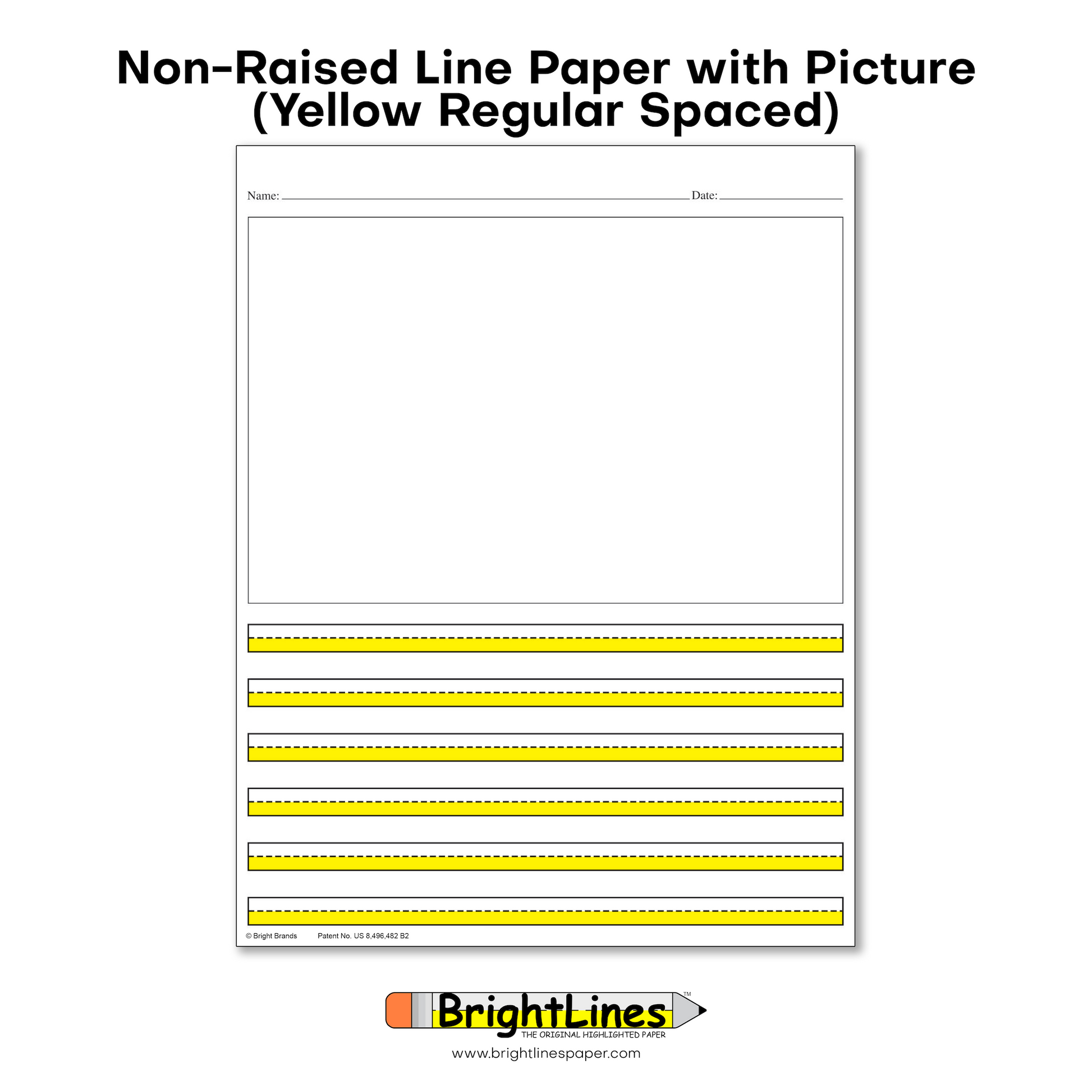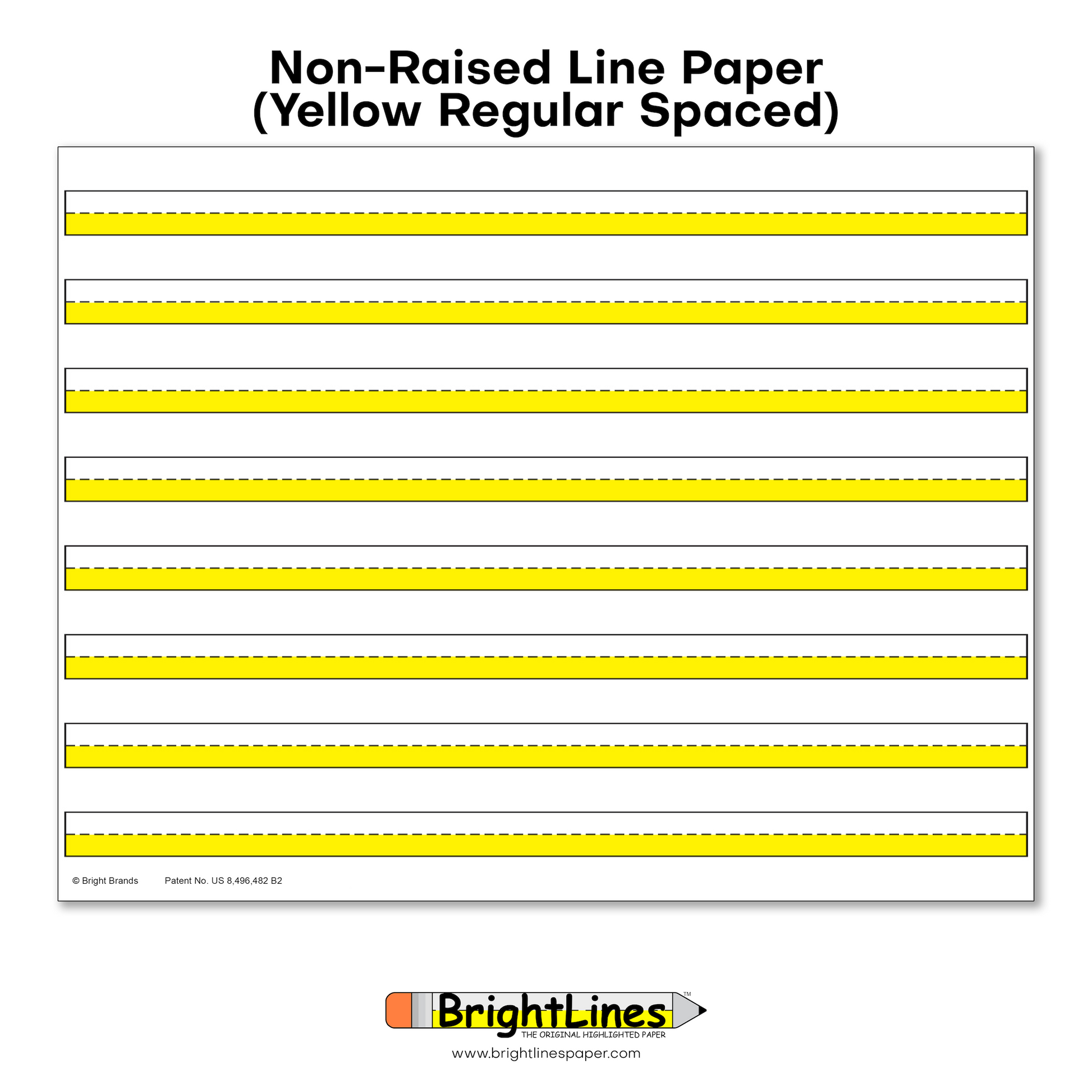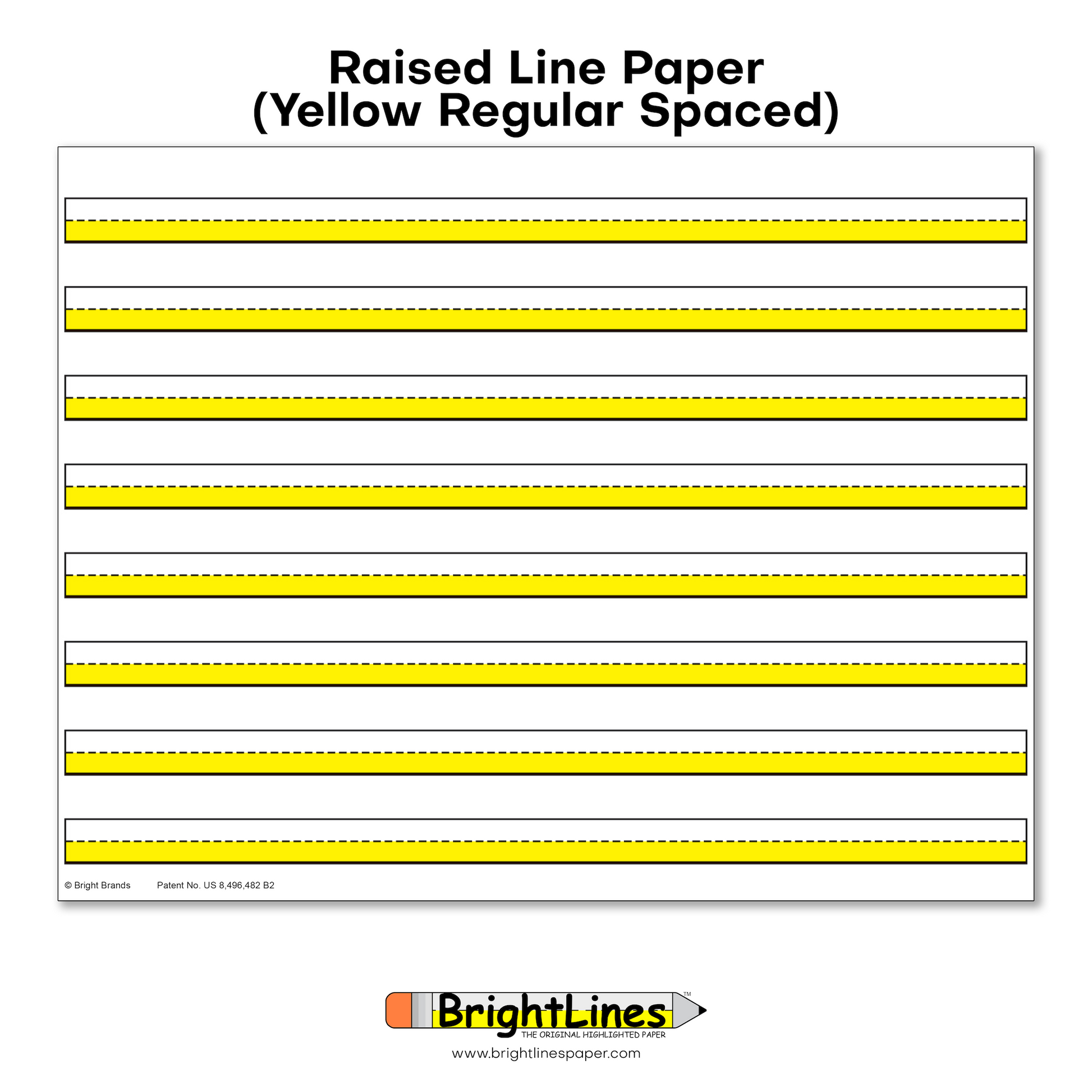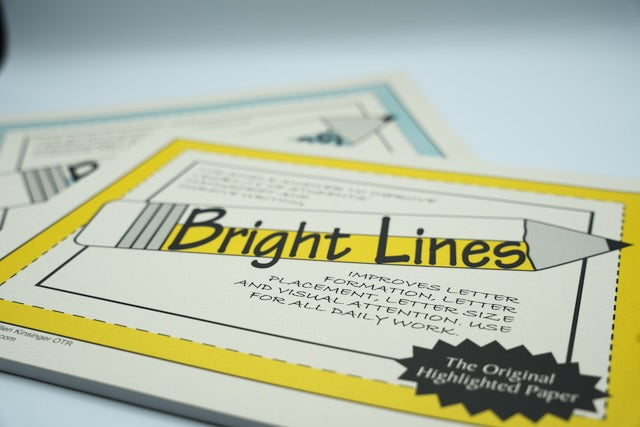 Since BrightLines Paper is simplified visually, the individual is able to form letters correctly with adequate space between words. The lower half of the writing area has been emphasized with yellow or blue color and indicates where the lower case letters should be placed.